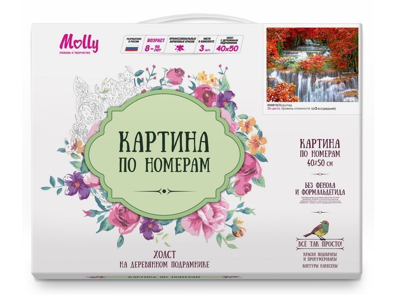 Используя кисти и краски, на холсте можно нарисовать каскад водопадов, где огромный поток воды падает вниз, представляя собой захватывающее зрелище. Ярко-красная листва кустарников по краям водопада выступает в роли красивого обрамления. Для такого творчества не требуются специальные художественные навыки. Нужно лишь следовать инструкции и время от времени сверяться с цветовой схемой рисунка.