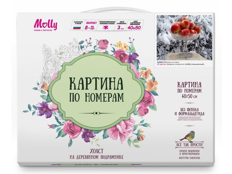 Используя кисти и краски, на холсте можно нарисовать натюрморт с изображением яблок в хрустальной вазе на кружевной салфетке. Фоном для натюрморта выступают ветви елей, густо усыпанные пушистым снегом. Для такого творчества не требуются специальные художественные навыки. Нужно лишь следовать инструкции и время от времени сверяться с цветовой схемой рисунка.