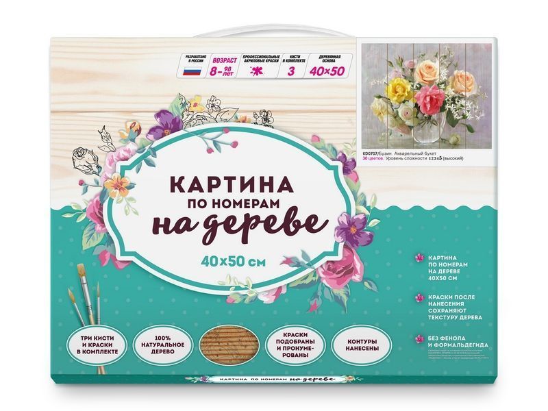 Используя кисти и краски, на основе из натурального дерева можно нарисовать картину Игоря Бузина "Акварельный букет" - нежный букет роз с эффектом прозрачности, воздушности, невесомости. Для такого творчества не требуются специальные художественные навыки. Нужно лишь следовать инструкции и время от времени сверяться с цветовой схемой рисунка. Для выделения отдельных зон есть 2 баночки лака. В подарок - держатель для красок. В наборе есть крепление на стену.