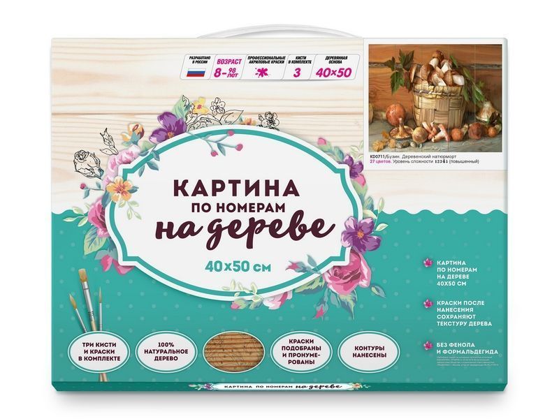 Используя кисти и краски, на основе из натурального дерева можно нарисовать картину Игоря Бузина "Деревенский натюрморт" - плетеная корзина, наполненная грибами. Для такого творчества не требуются специальные художественные навыки. Нужно лишь следовать инструкции и время от времени сверяться с цветовой схемой рисунка. Для выделения отдельных зон есть 2 баночки лака. В подарок - держатель для красок. В наборе есть крепление на стену.