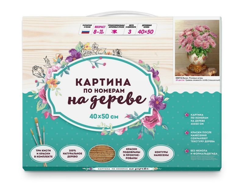 Картина по номерам на дереве 40х50 БУЗИН. РОЗОВЫЕ АСТРЫ (29 цветов)