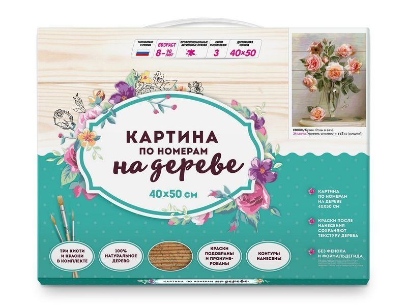 Используя кисти и краски, на основе из натурального дерева можно нарисовать картину Игоря Бузина "Розы в вазе" - нежный букет роз в высокой вазе. Для такого творчества не требуются специальные художественные навыки. Нужно лишь следовать инструкции и время от времени сверяться с цветовой схемой рисунка. Для выделения отдельных зон есть 2 баночки лака. В подарок - держатель для красок. В наборе есть крепление на стену.
