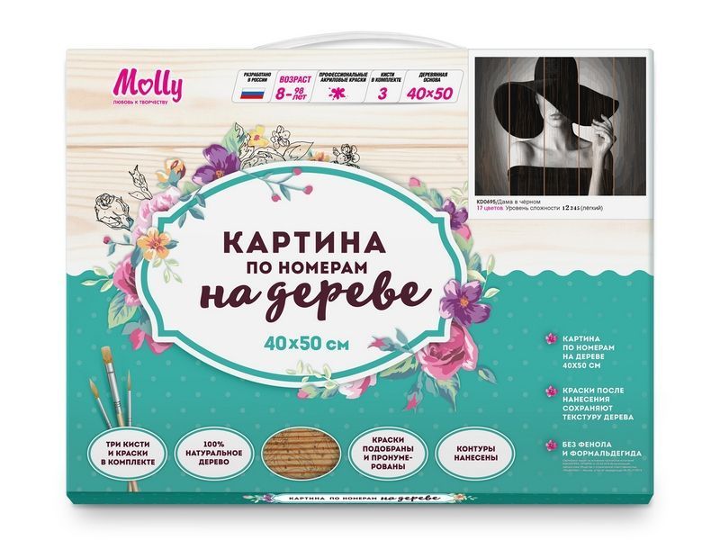 Используя кисти и краски, на основе из натурального дерева можно нарисовать даму в черном платье и шляпе, закрывающей основную часть лица. Черно-белые тона, используемые в картине, делают картину особо стильной. Для такого творчества не требуются специальные художественные навыки. Нужно лишь следовать инструкции и время от времени сверяться с цветовой схемой рисунка. Для выделения отдельных зон есть 2 баночки лака. В подарок - держатель для красок. В наборе есть крепление на стену.