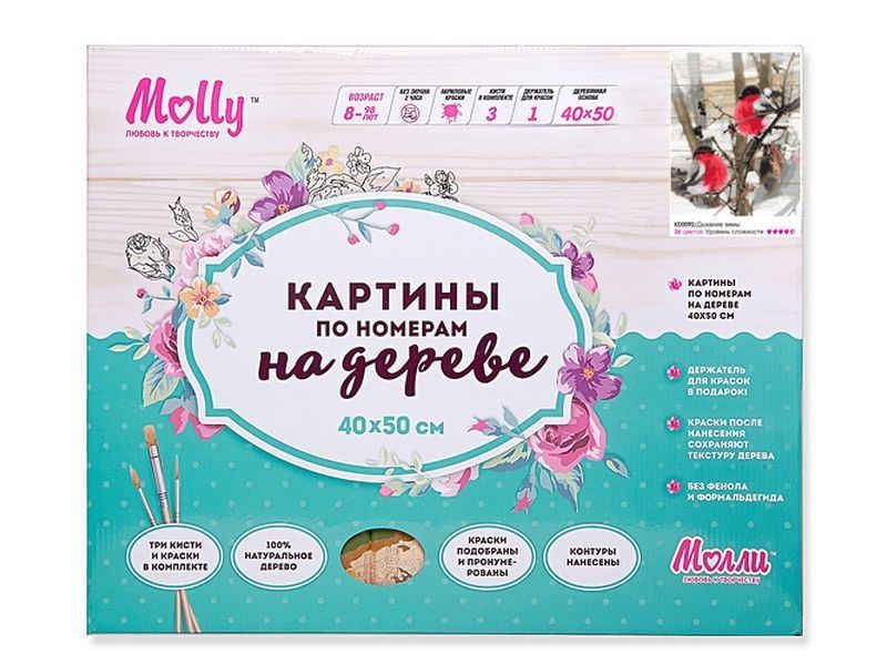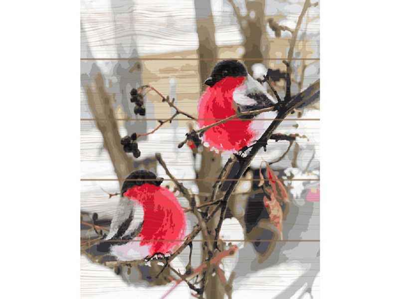 Используя кисти и краски, на основе из натурального дерева можно нарисовать снегирей, сидящих на ветке рябины, усыпанной снегом. Для такого творчества не требуются специальные художественные навыки. Нужно лишь следовать инструкции и время от времени сверяться с цветовой схемой рисунка. Для выделения отдельных зон есть 2 баночки лака. В подарок - держатель для красок. В наборе есть крепление на стену.