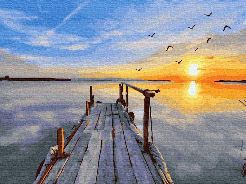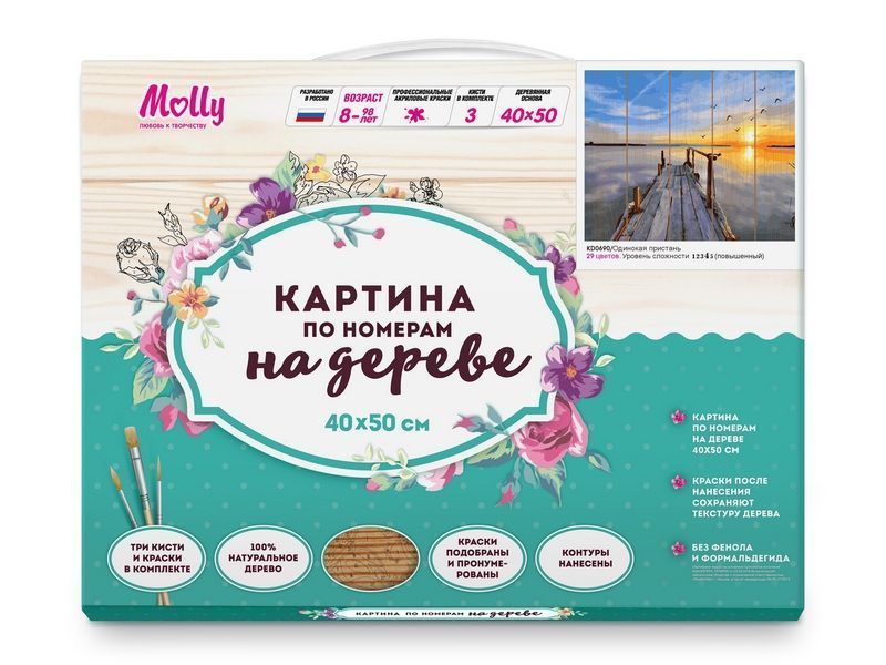 Используя кисти и краски, на основе из натурального дерева можно нарисовать пристань, уходящую далеко в гладь реки на фоне красивого заката. Для такого творчества не требуются специальные художественные навыки. Нужно лишь следовать инструкции и время от времени сверяться с цветовой схемой рисунка. Для выделения отдельных зон есть 2 баночки лака. В подарок - держатель для красок. В наборе есть крепление на стену.