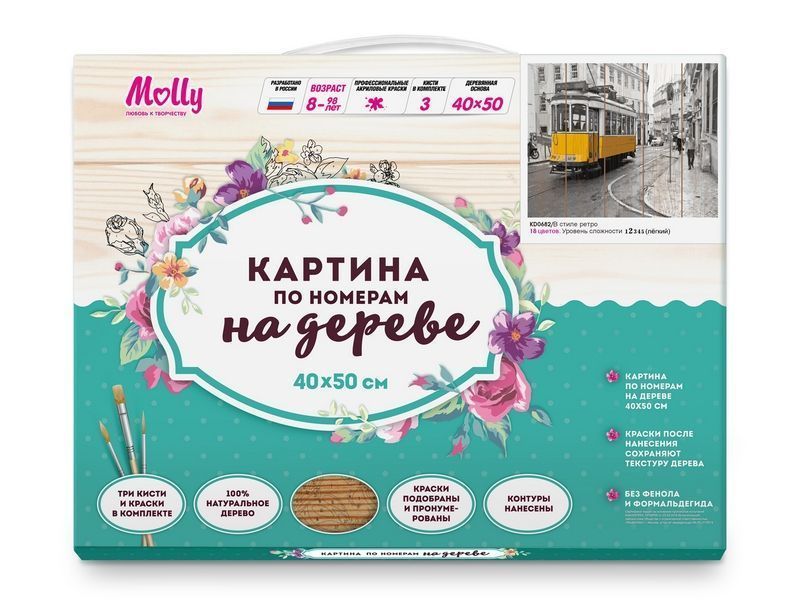 Используя кисти и краски, на основе из натурального дерева можно создать городской пейзаж в ретро стиле. На картине изображена городская улочка, по которой перемещается ярко-желтый трамвай. При создании картины используются три-четыре основных цвета. Для такого творчества не требуются специальные художественные навыки. Нужно лишь следовать инструкции и время от времени сверяться с цветовой схемой рисунка. Для выделения отдельных зон есть 2 баночки лака. В подарок - держатель для красок. В наборе есть крепление на стену.