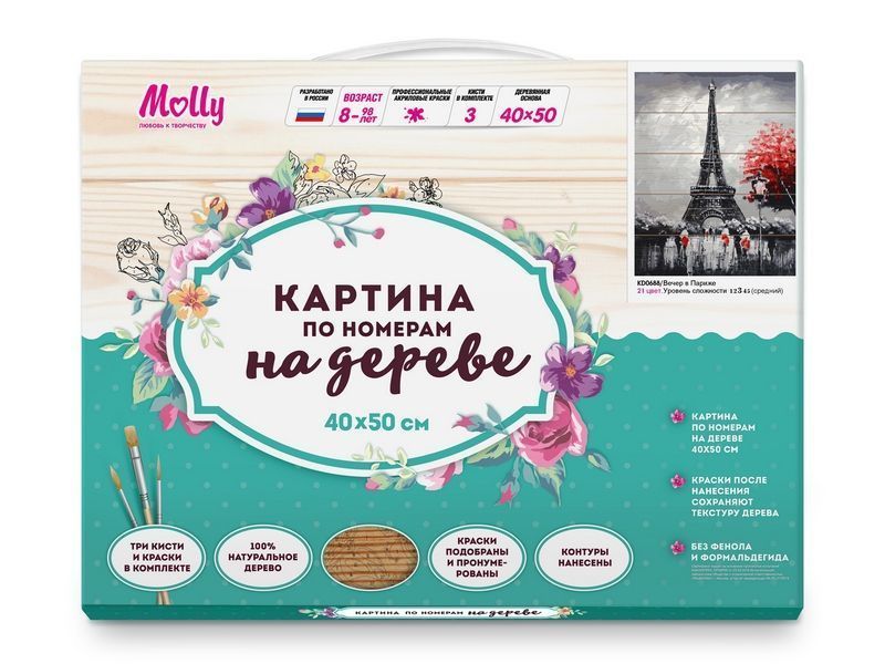Используя кисти и краски, на основе из натурального дерева можно нарисовать парижский пейзаж с символом Парижа - Эйфелевой башней. Рядом с башней прогуливаются многочисленные влюбленные парочки, укрываясь от дождя под зонтами. Красные цветовые акценты делают картину особенно стильной, придают ей дополнительный шарм. Для такого творчества не требуются специальные художественные навыки. Нужно лишь следовать инструкции и время от времени сверяться с цветовой схемой рисунка. Для выделения отдельных зон есть 2 баночки лака. В подарок - держатель для красок. В наборе есть крепление на стену.