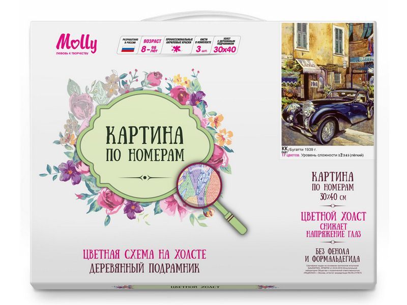Используя кисти и краски, на холсте можно нарисовать картину с изображением Бугатти 1939 года. В 1908 году талантливый инженер Этторе Бугатти создал в подвале своего дома первый Bugatti. В довоенный период автомобили Bugatti были символом роскоши. Концепцию Бугатти ее создатель выражал так: "Вес - наш враг". Например, Бугатти 1927 года весил всего 750 килограмм. Для такого творчества не требуются специальные художественные навыки. Нужно лишь следовать инструкции и время от времени сверяться с цветовой схемой рисунка.