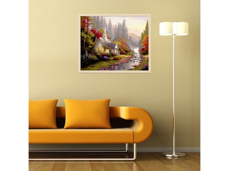 Используя кисти и краски, на холсте можно нарисовать уютный домик на берегу горной реки в окружении величественных гор и многолетних сосен. Для такого творчества не требуются специальные художественные навыки. Нужно лишь следовать инструкции и время от времени сверяться с цветовой схемой рисунка.