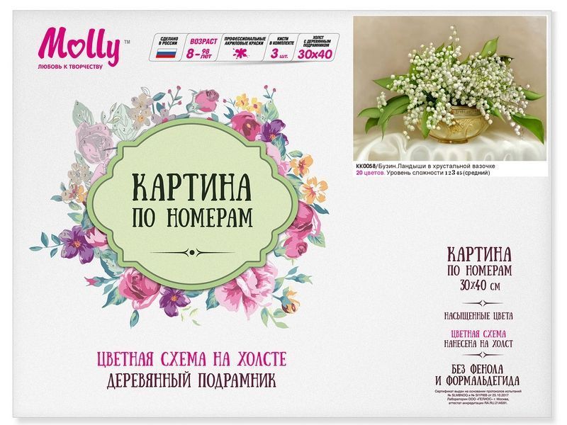 Используя кисти и краски, на холсте можно нарисовать картину Игоря Бузина "Ландыши в хрустальной вазочке". Для такого творчества не требуются специальные художественные навыки. Нужно лишь следовать инструкции и время от времени сверяться с цветовой схемой рисунка.