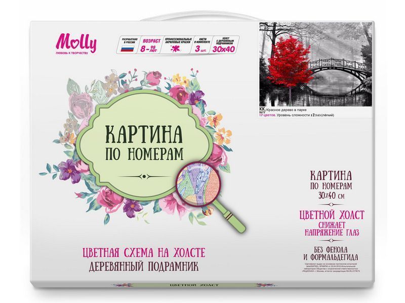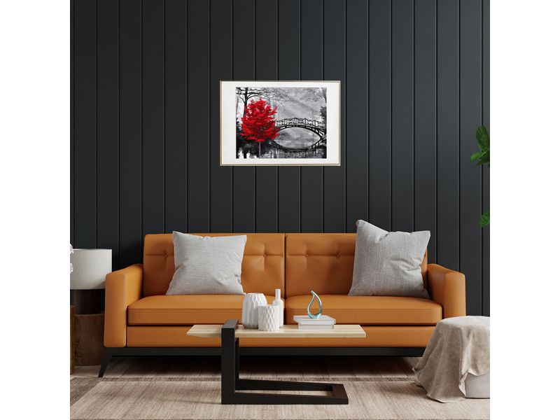 Используя кисти и краски, на холсте можно нарисовать эффектную монохромную картину в оттенках серого с изображением реки и моста через нее, на которой единственным ярким акцентом является ярко-красное дерево. Для такого творчества не требуются специальные художественные навыки. Нужно лишь следовать инструкции и время от времени сверяться с цветовой схемой рисунка.