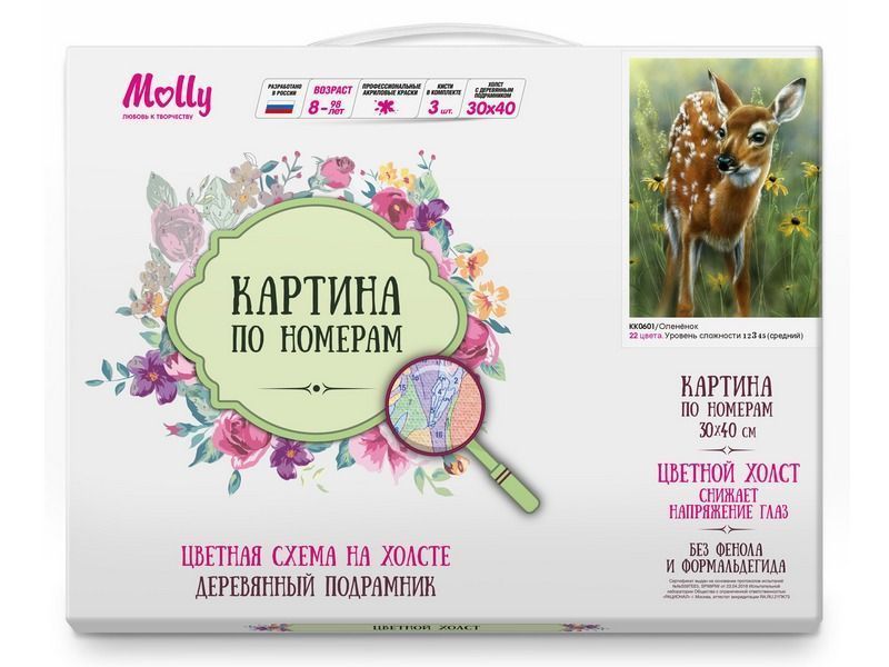 Используя кисти и краски, на холсте можно нарисовать любопытного олененка, гуляющего в траве. Для такого творчества не требуются специальные художественные навыки. Нужно лишь следовать инструкции и время от времени сверяться с цветовой схемой рисунка.