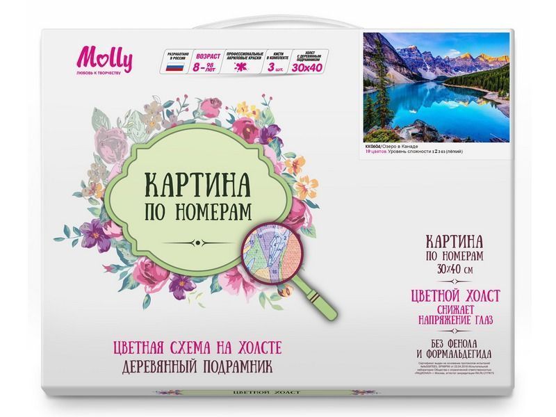 Используя кисти и краски, на холсте можно нарисовать Озеро в Канаде с потрясающим пейзажем. Для такого творчества не требуются специальные художественные навыки. Нужно лишь следовать инструкции и время от времени сверяться с цветовой схемой рисунка.