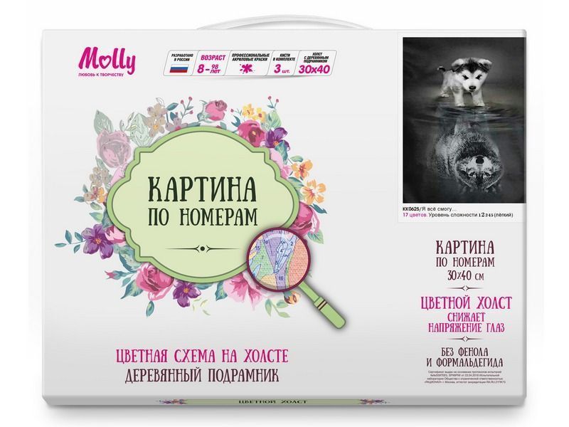 Используя кисти и краски, на холсте можно нарисовать картину-метафору "Я все смогу", на которой щенок хаски смотрит на свое отражение в луже и видит большую собаку. Для такого творчества не требуются специальные художественные навыки. Нужно лишь следовать инструкции и время от времени сверяться с цветовой схемой рисунка.