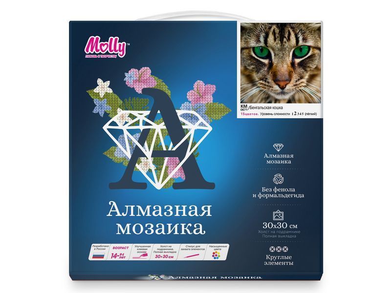 В наборе "Бенгальская кошка" из мозаичных элементов на холсте можно выложить портрет бенгальской кошки. Бенгальские кошки прекрасные охотники, очень любят воду, а также дружат с собаками.
