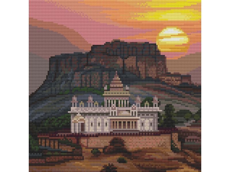 В наборе "Форт Мехрангарх" из мозаичных элементов на холсте можно выложить изображение с одним из внушительных фортов в Индии - Форт Мехрангарх. Крепость выглядит еще более величественно на фоне закатного неба.