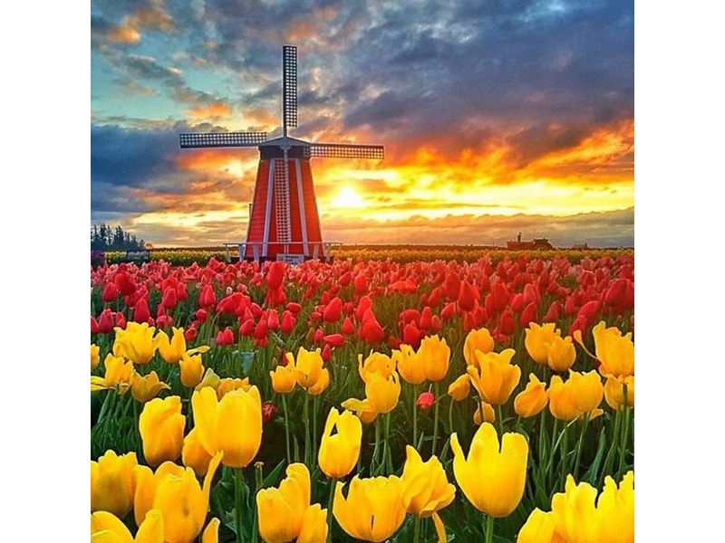 В наборе "Поля тюльпанов в Нидерландах" из мозаичных элементов можно выложить бесконечное поле с красными и жёлтыми тюльпанами.