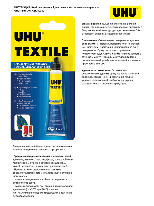 Клей для текстиля UHU Textil, 19 г, блистер