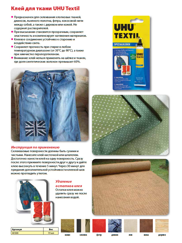 Клей UHU Textil предназначен для склеивания хлопковых тканей, джинсов, льняного полотна, фетра, кокосовой нити между собой, а так же с деревом или кожей. Не содержит растворителя.При выс…