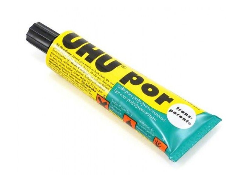 Клей для пенокартона UHU POR. Состав клея не агрессивен по отношению к разным сортам пенопласта, поэтому UHU Por идеально подходит для склеивания их как между собой, так и с другими материалами. Также используется для склеивания цветных сортов бумаги со специальной пропиткой и фотобумаги. Клеевое соединение устойчиво к воздействию воды, сохраняет свои свойства в температурном диапазоне от -25°С до +60°С, при высыхании становится практически бесцветным. Минимальная рабочая температура +6°С. При склеивании больших поверхностей расход должен составлять 150-250 г на кв.м.