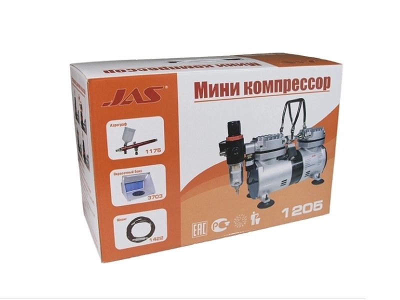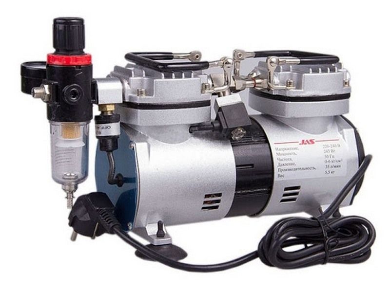 Специализированный даухголовый компрессор JAS 1205 для работы с аэрографом с ручной регулировкой давления на выходе. Применяется для работ значительных по площади - дизайн стен, работа с широкими соплами, распыление относительно густых материалов, для кондитерского производства.