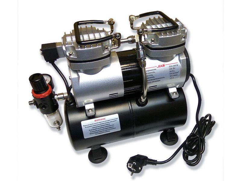 Два режима работы позволяют использовать компрессор Jas 1206 с миниатюрным инструментом. Рабочее давление стабилизируется ресивером. Необходим шланг для соединения с аэрографом.