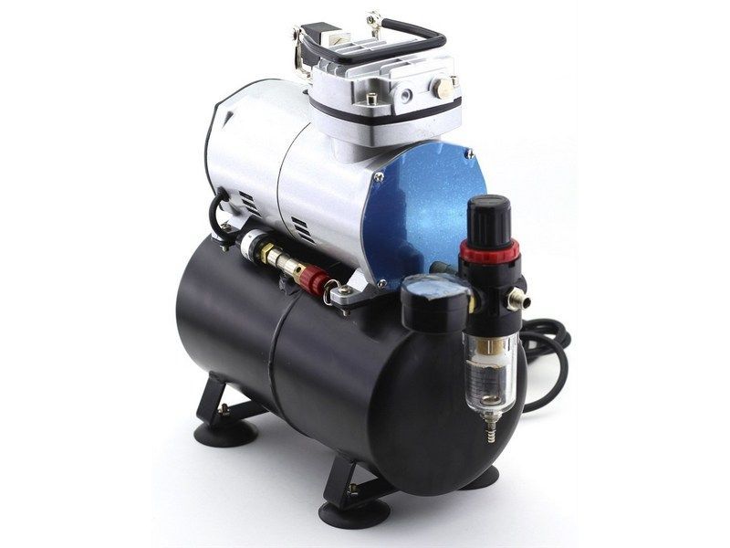 Имеет небольшие размеры, обычно его размещают под рабочим столом. Необходим шланг для соединения с аэрографом.