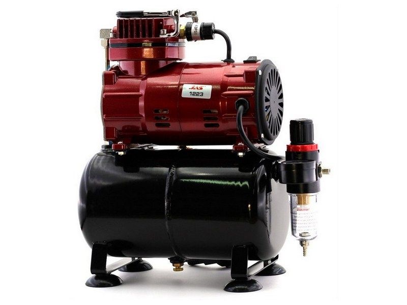 Встроенный фильтр на выходе отчищает воздух от пыли и влаги, что очень актуально при работе с аэрографом. Также к достоинствам данного компрессора можно отнести малое потребление электроэнергии и низкий уровень шума.
