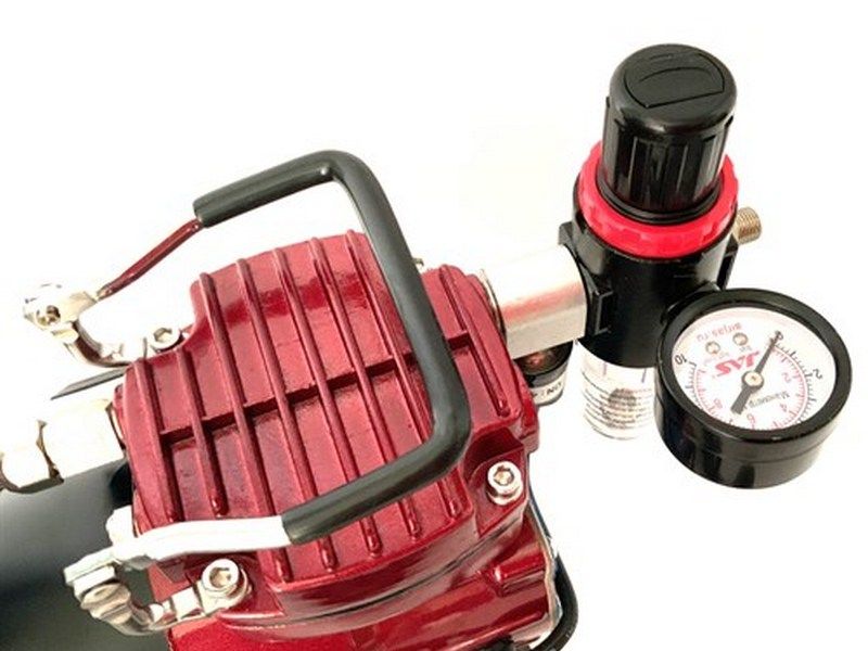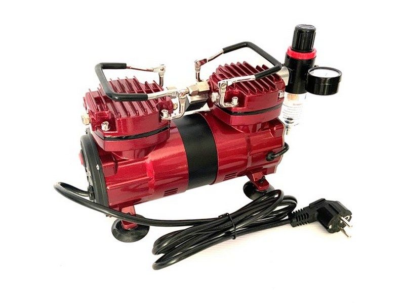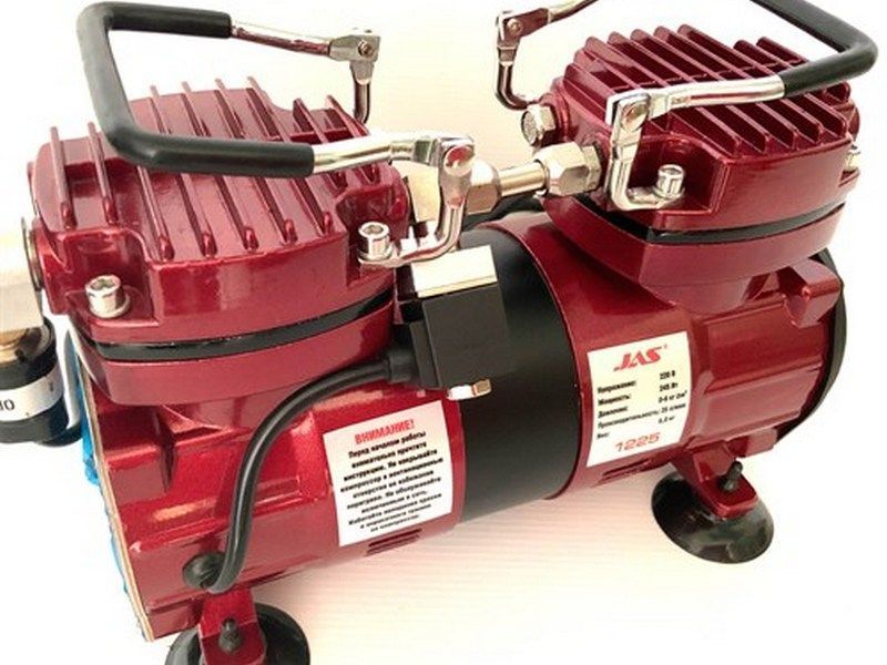 Двухцилиндровый компрессор Jas-1225 повышенной мощности. Производительности хватает для работы двумя аэрографами одновременно.