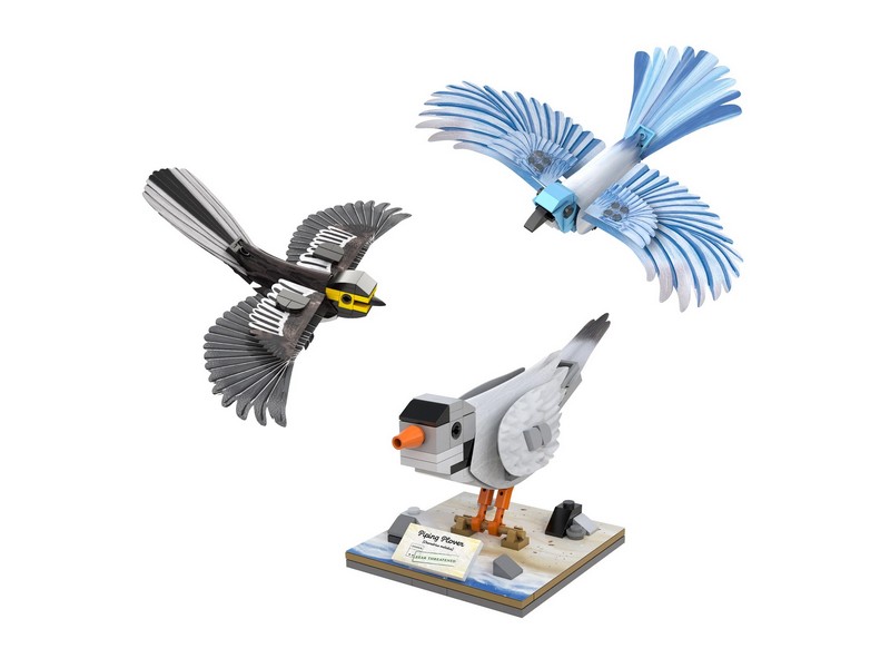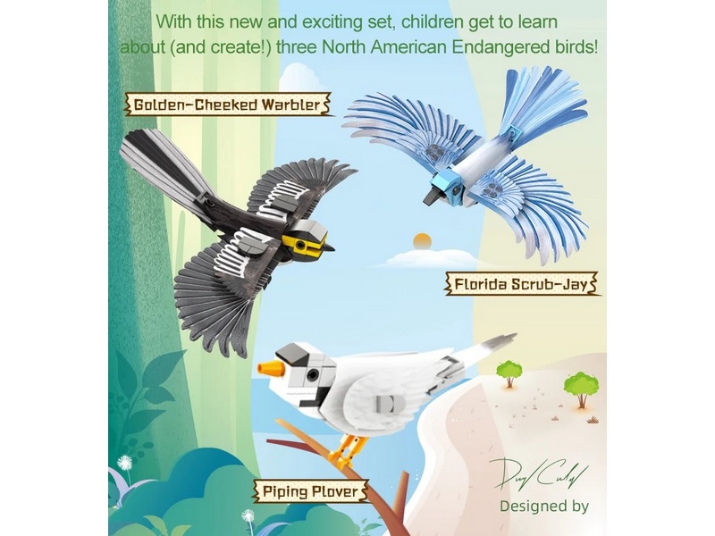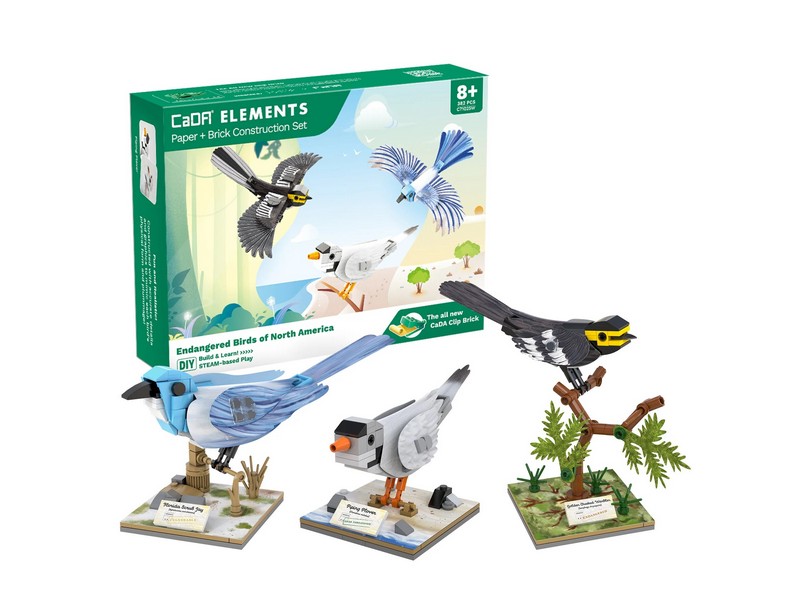 Конструктор от CADA представляет собой набор для постройки моделей североамериканских птиц из 350 деталей. Набор включает в себя золотощёкого лесного певуна, голубую кустарниковую сойку, желтоногого зуйка и подставки к ним. Птицы имеют съёмные крылья, которые позволяют оформить модель сидящей на ветке или в полёте. Таблички показывают название птицы, научное название вида и природоохранный статус.