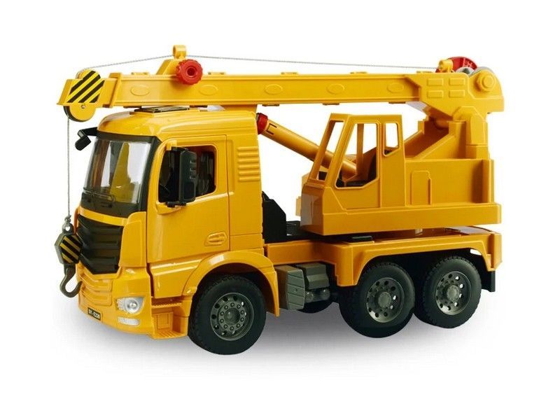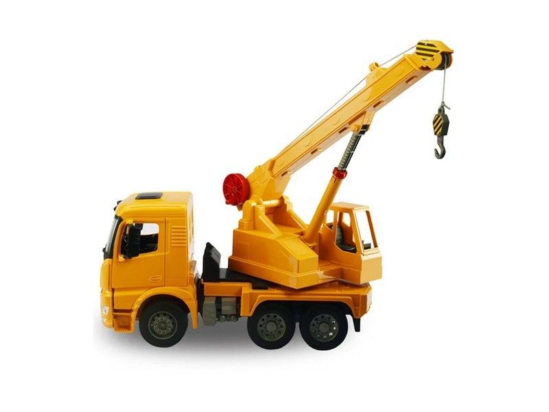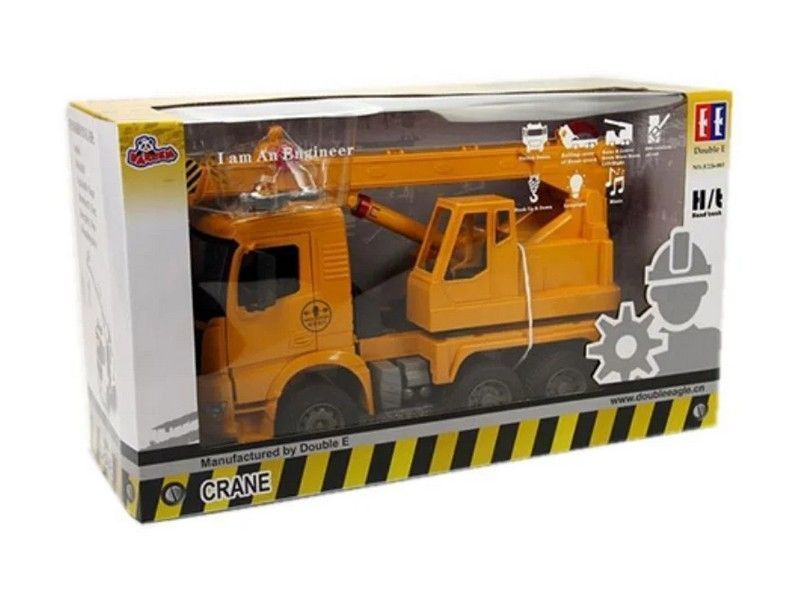 Радиоуправляемый автокран от Double Eagle в масштабе 1:20. Модель имеет полный привод, это дает ей возможность совершать маневренные движения в различных направлениях. Машина издает звуковые сигналы. Кабина водителя опрокидывается, двери открываются. Зеркала можно сложить. Стрела крана поднимается и опускается, также стрелу можно выдвинуть, увеличив её длину. Крюк опускается и поднимается с помощью ручной лебедки. Платформа с краном вращается на 360 градусов. Для придания большей реалистичности у машины при движении включаются фары.