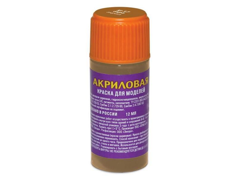 Акриловая краска на водной основе для сборных моделей и других увлечений и хобби. Краска готова для работы с ней. Краска разбавляется водой. Подходит для окраски моделей из пластика, металла, дерева, бумаги с помощью кисти.