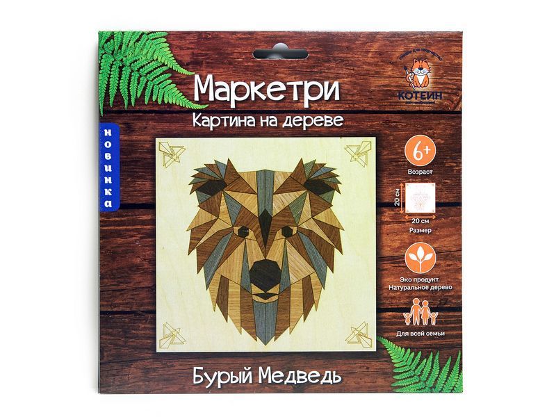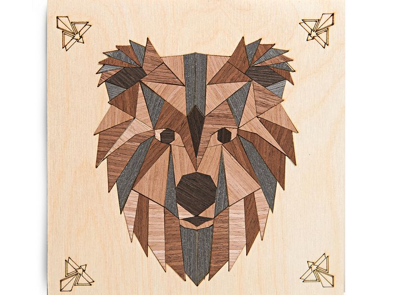 С помощью набора для творчества из тонких пластин из натурального шпона на основе можно выложить картину с изображением бурого медведя. Детали шпона нужно отделить по контуру от основы и выложить из них мозаику.