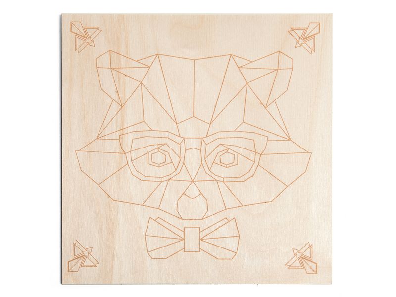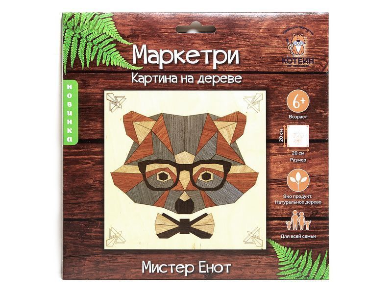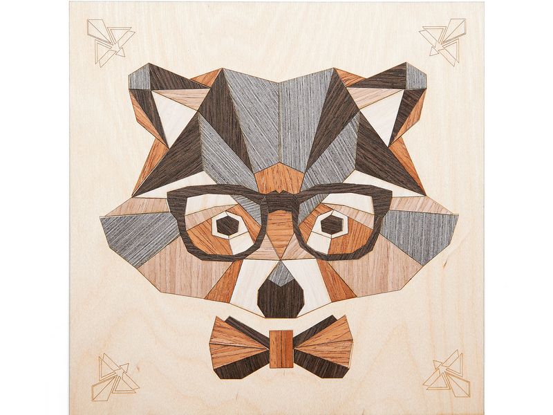 С помощью набора для творчества из тонких пластин из натурального шпона на основе можно выложить картину с изображением мистера енота. Детали шпона нужно отделить по контуру от основы и выложить из них мозаику.