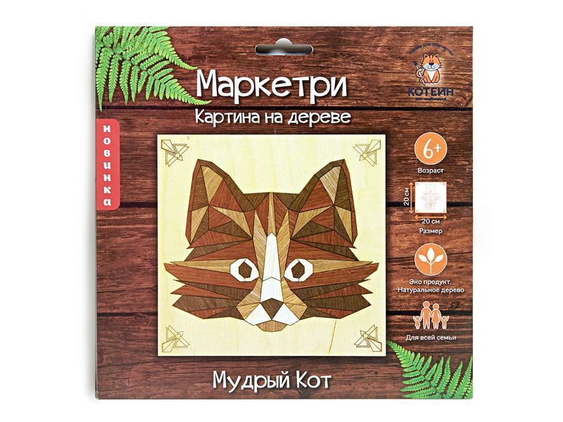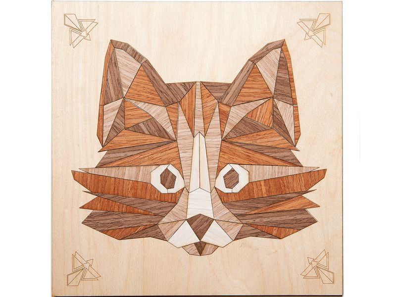 С помощью набора для творчества из тонких пластин из натурального шпона на основе можно выложить картину с изображением мудрого кота. Детали шпона нужно отделить по контуру от основы и выложить из них мозаику.