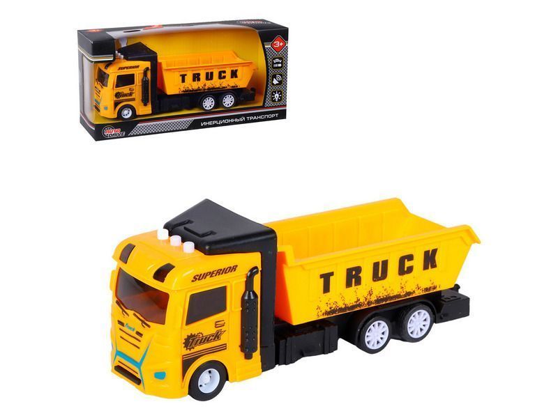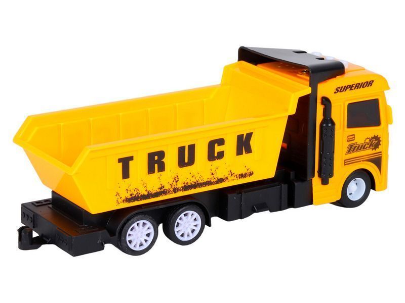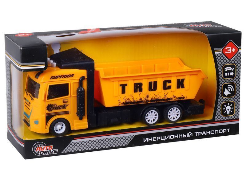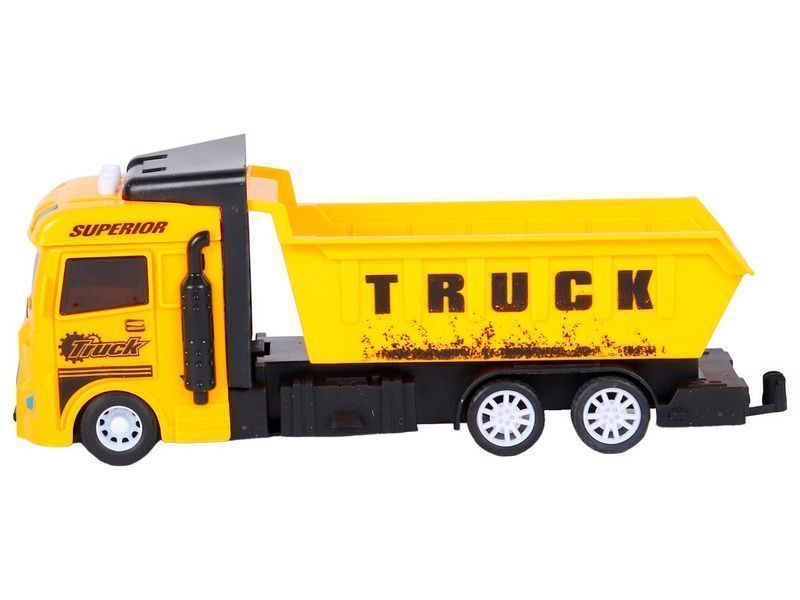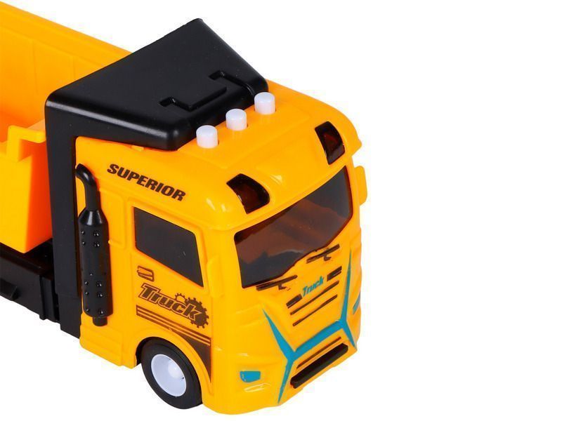 Строительный грузовик – это уменьшенная копия настоящей спецтехники с высокой детализацией и качественной покраской всех элементов. На кабине грузовика размещены кнопки, при нажатии на которые воспроизводятся звуки работы двигателя, звуки сигнала автомобиля, а также начинают мигать световые маячки.
