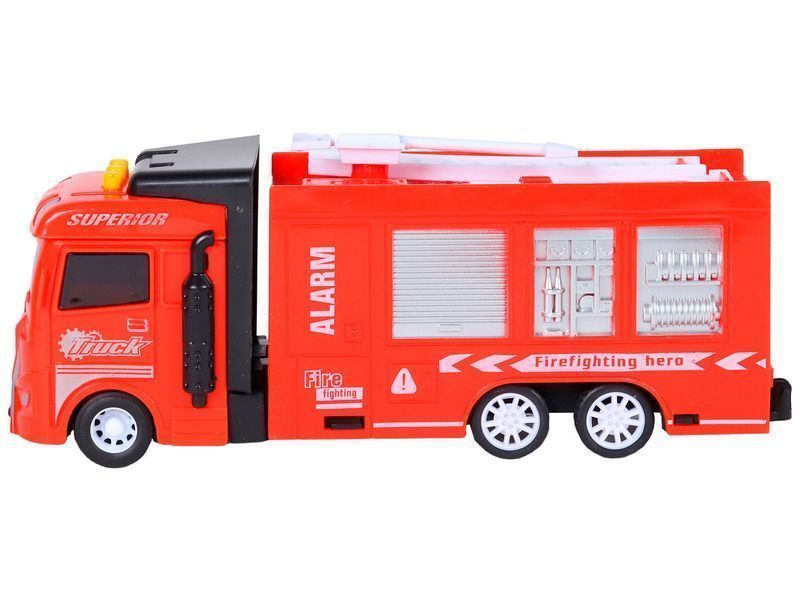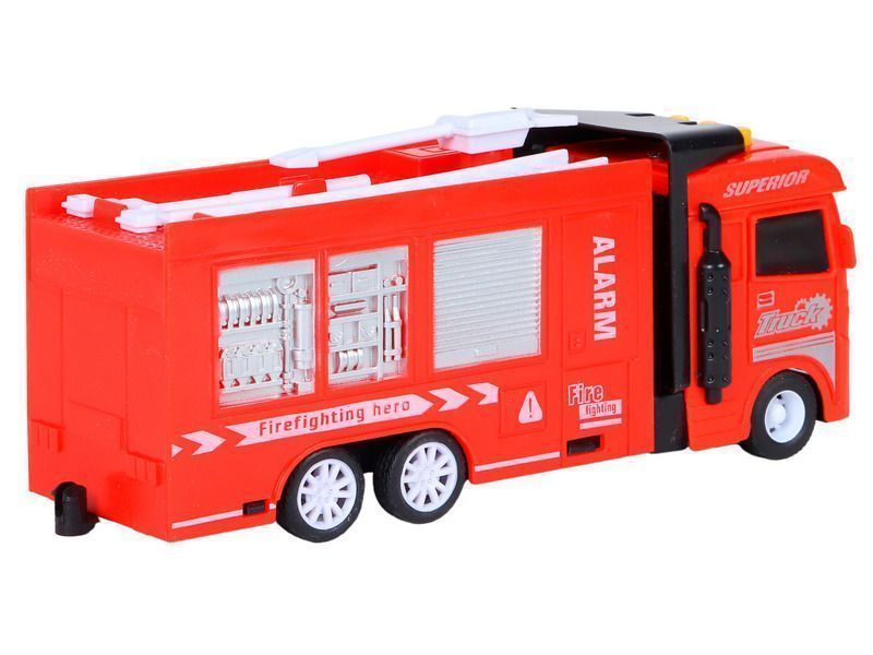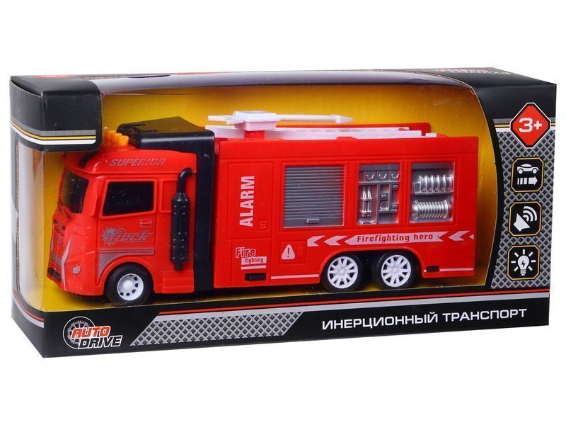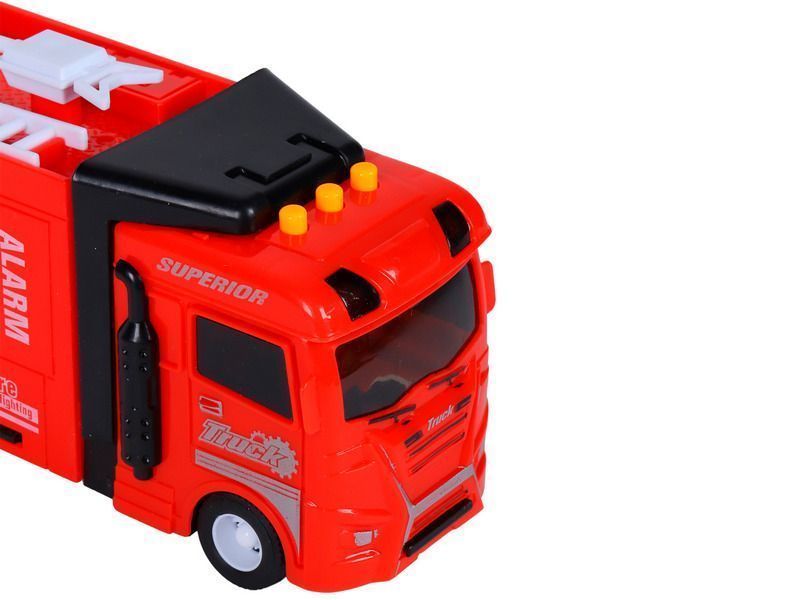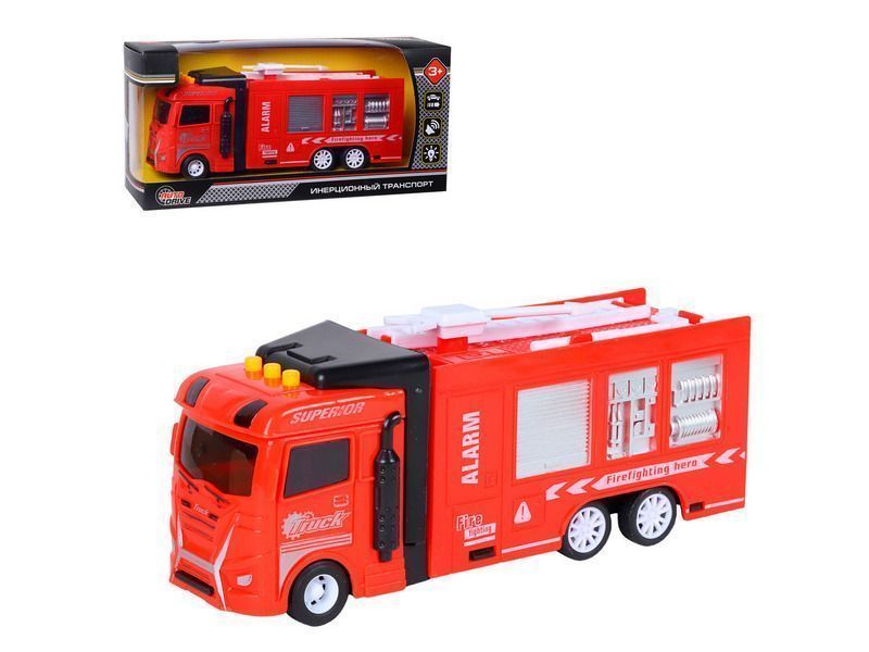Пожарная машина – это уменьшенная копия настоящей спецтехники с высокой детализацией и качественной покраской всех элементов. На кабине машины размещены кнопки, при нажатии на которые воспроизводятся звуки работы двигателя, звуки сигнала автомобиля, а также начинают мигать световые маячки.