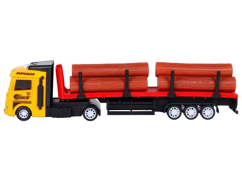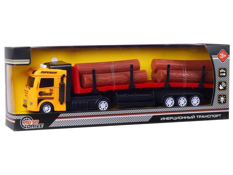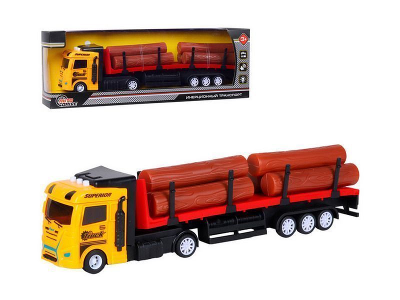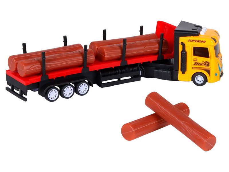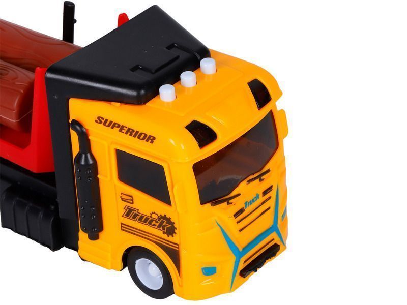 Трейлер – это уменьшенная копия настоящей спецтехники с высокой детализацией и качественной покраской всех элементов. В наборе с трейлером идут игрушечные бревна, которые ребенок сможет перевозить. На кабине трейлера размещены кнопки, при нажатии на которые воспроизводятся звуки работы двигателя, звуки сигнала автомобиля, а также начинают мигать световые маячки.