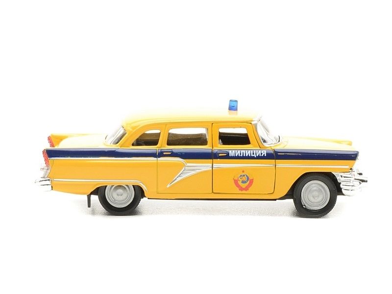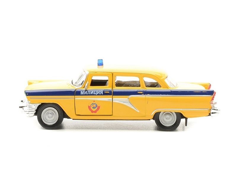 Инерционная коллекционная модель Autotime ГАЗ-13 "Чайка" - уменьшенная копия реального автомобиля. Игрушка изготовлена из металла и высококлассного пластика. У нее вращаются колеса. Двери машинки открываются, что позволяет рассмотреть салон изнутри в деталях. Модель ГАЗ-13 "Чайка" выполнена желтом цвете с гербом и надписью милиция на дверях и оборудована спецсигналом на крыше.
