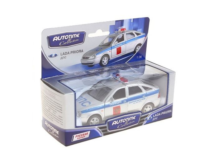 Инерционная коллекционная модель Autotime Lada Priora ДПС - уменьшенная копия реального автомобиля. Игрушка изготовлена из металла и высококлассного пластика. Уровень детализации машинки достаточно высок. У нее вращаются колеса. Двери машинки и багажник открываются, это позволяет хозяину игрушки не только посмотреть, но и потрогать салон машинки. Также ребенок сможет положить в багажник что-нибудь небольшого размера. Модель машины имеет вариант расцветки ДПС.