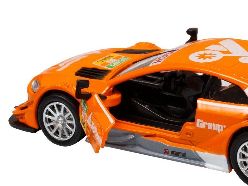 Модель выполнена в масштабе 1:43, у нее открываются передние двери и вращаются резиновые колеса. Яркий спортивный дизайн, спойлер, спортивный обвес впечатлит любого водителя. Игрушка оснащена инерционным механизмом - если откатить автомобиль немного назад и отпустить, он поедет вперед.