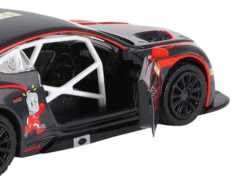 Модель выполнена в масштабе 1:32, у нее открываются двери, капот. Яркий спортивный дизайн, спойлер, обтекаемая форма кузова, спортивный обвес придают суперкару стремительный внешний вид. Колеса с резиновыми покрышками и литыми дисками, детально проработанный салон и моторный отсек, фары, прозрачные окна - всё как у настоящего автомобиля.