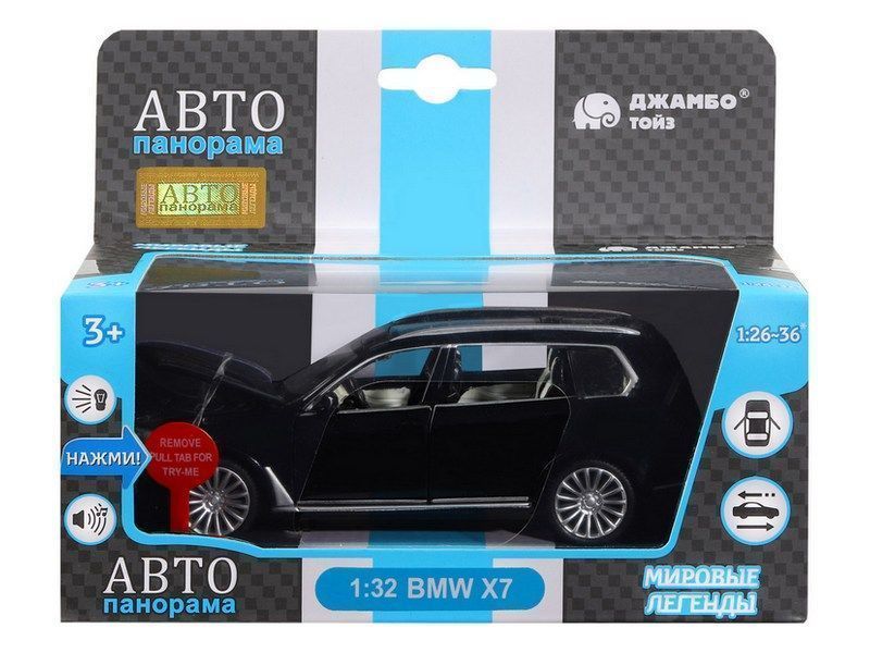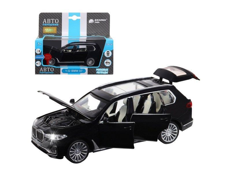 Машина "АВТОПАНОРАМА" BMW X7, черный, 1/32, свет, звук, инерция, в/к 17,5*13,5*9 см