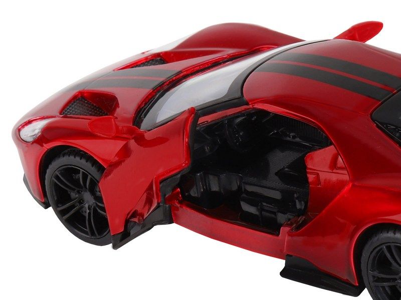 Модель выполнена в масштабе 1:32, у нее открываются передние двери. Колеса с резиновыми покрышками и литыми дисками, детально проработанный салон и моторный отсек, спойлер, прозрачные окна и крыша, фары - всё как у настоящего автомобиля.