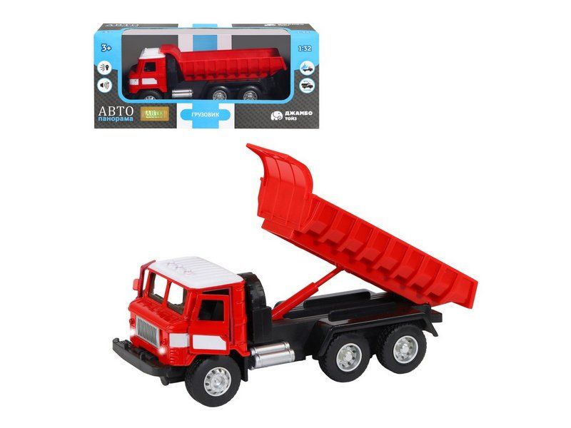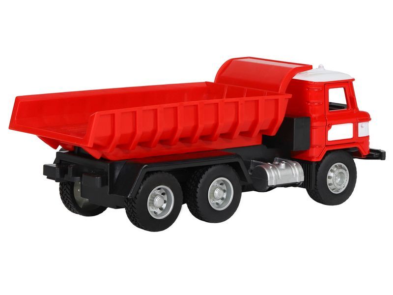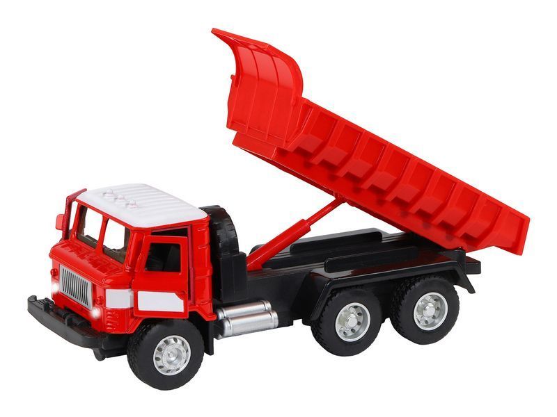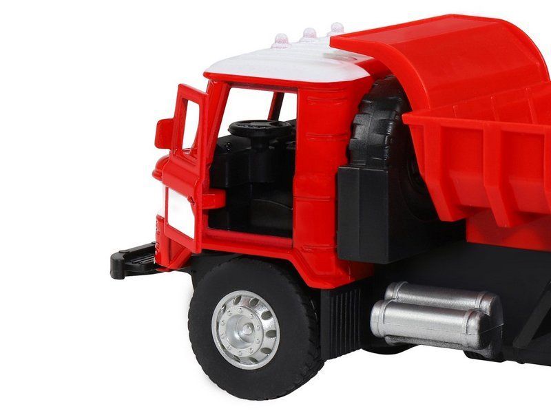 Игрушка хорошо детализирована, имеет крепкий корпус, подвижные элементы, у нее открываются двери в кабине, поднимается и опускается кузов, в котором можно перевозить небольшие предметы до места назначения.