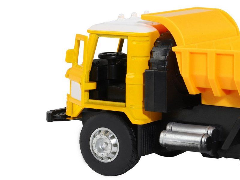 При нажатии на корпус загорается свет фар и включается звук, что делает игру более реалистичной и интересной. Устойчивые колеса с резиновыми покрышками надежно закреплены и справятся со сложными условиями на игрушечной стройплощадке.