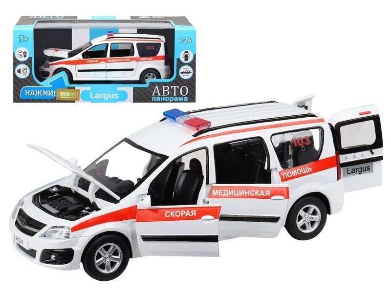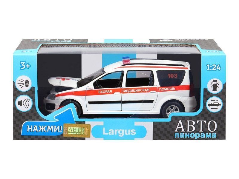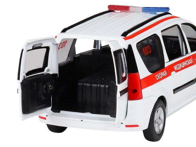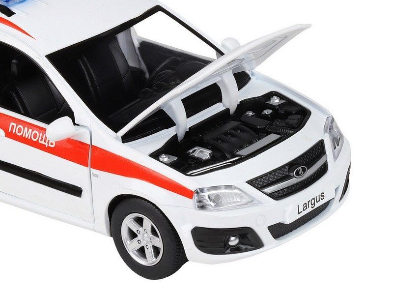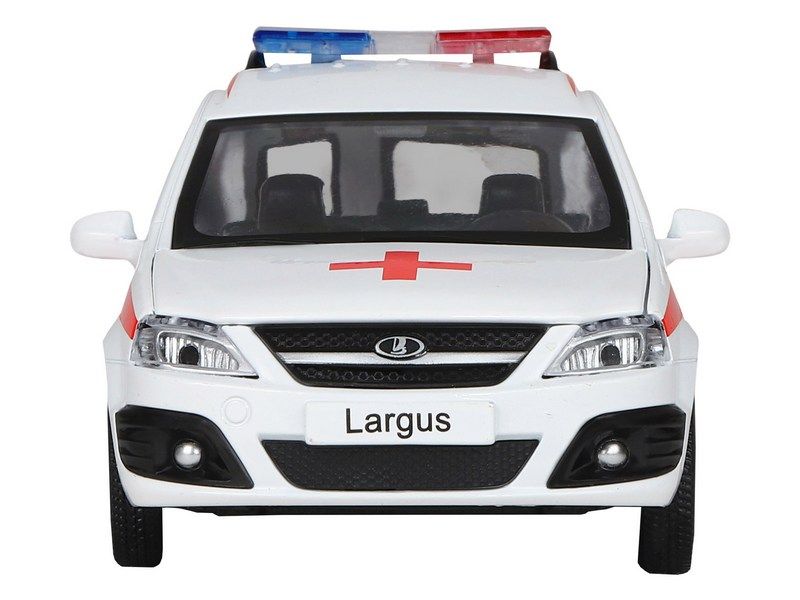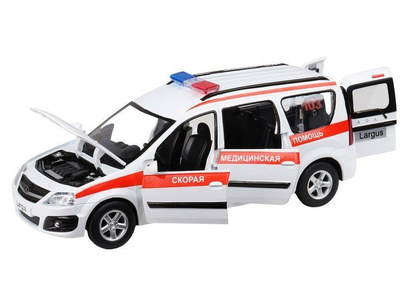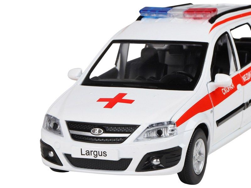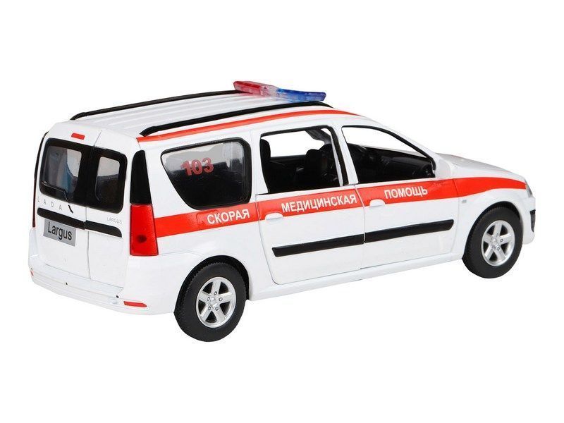 Металлическая лицензионная машинка LADA LARGUS "Скорая Помощь" - уменьшенная копия настоящего просторного универсала со специальной раскраской. Если помощь требуется любимой игрушке, нужно как можно скорее примчаться на вызов вместе с LADA LARGUS "Скорая Помощь". Машинка прекрасно дополнит игрушечный автопарк спецтранспорта, с ней можно создавать множество увлекательных игровых сюжетов, полных приключений.