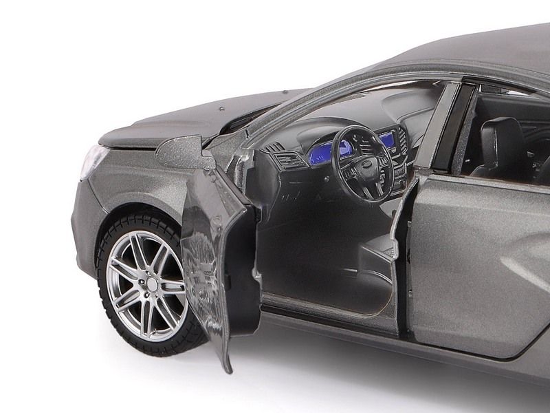 Модель выполнена в масштабе 1:24, у нее открываются 4 двери, капот и багажник. Игрушка оснащена инерционным механизмом - если откатить автомобиль немного назад и отпустить, он поедет вперед. При нажатии на корпус и при открытии дверей начинают светиться фары и включается звук.