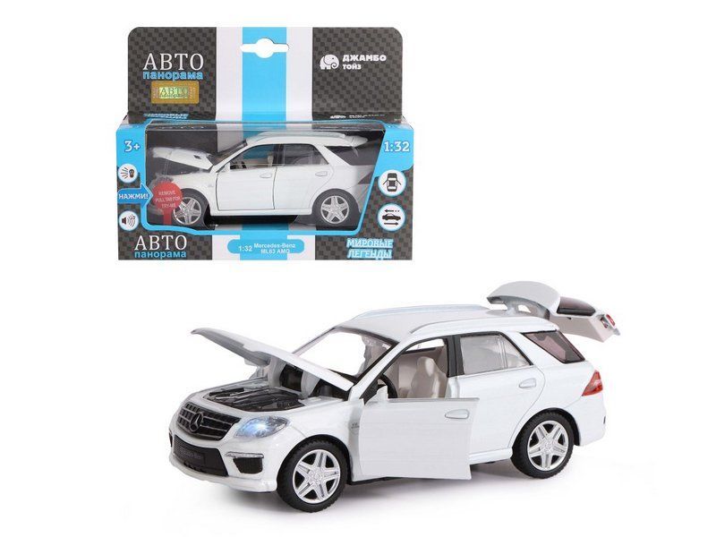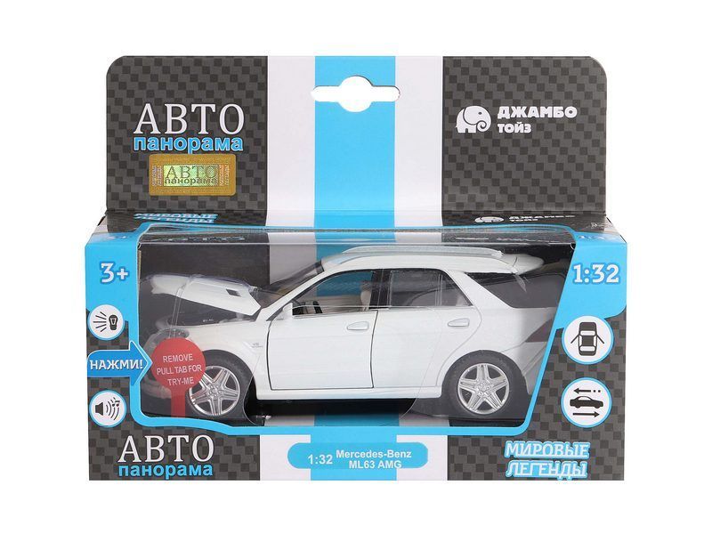 Металлическая машинка Mercedes-Benz ML63 AMG - уменьшенная копия легендарного немецкого внедорожника в масштабе 1:32. Модель машинки детально проработана и выполнена с легко узнаваемым дизайном как у оригинала, которую часто можно встретить на улицах города. Машинка выпущена известной компанией по производству игрушек Автопанорама. Особенность коллекции в том, что все модели изготовлены по лицензии именитых автопроизводителей.