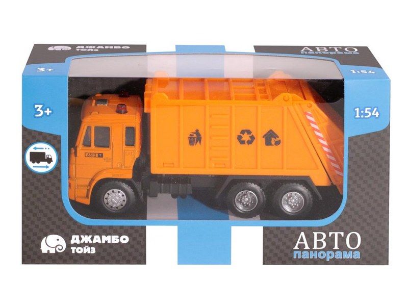 Модель "Мусоровоз" выполнена в виде металлического мусоровоза желтого цвета. Похожие машины иногда встречаются на улицах города или в музеях транспорта. Модель выполнена в масштабе 1:54, у нее открывается задняя крышка и откидывается задняя стенка бункера.